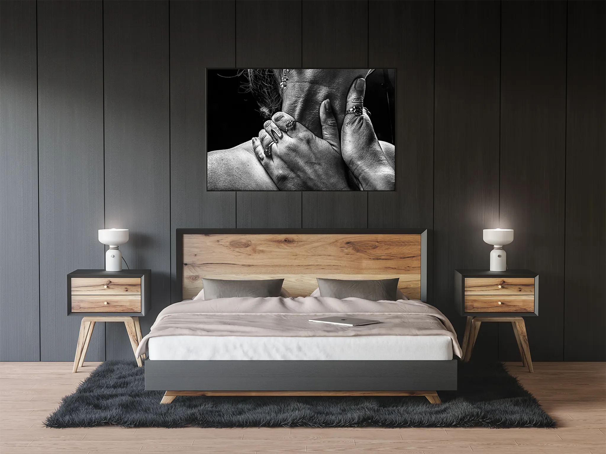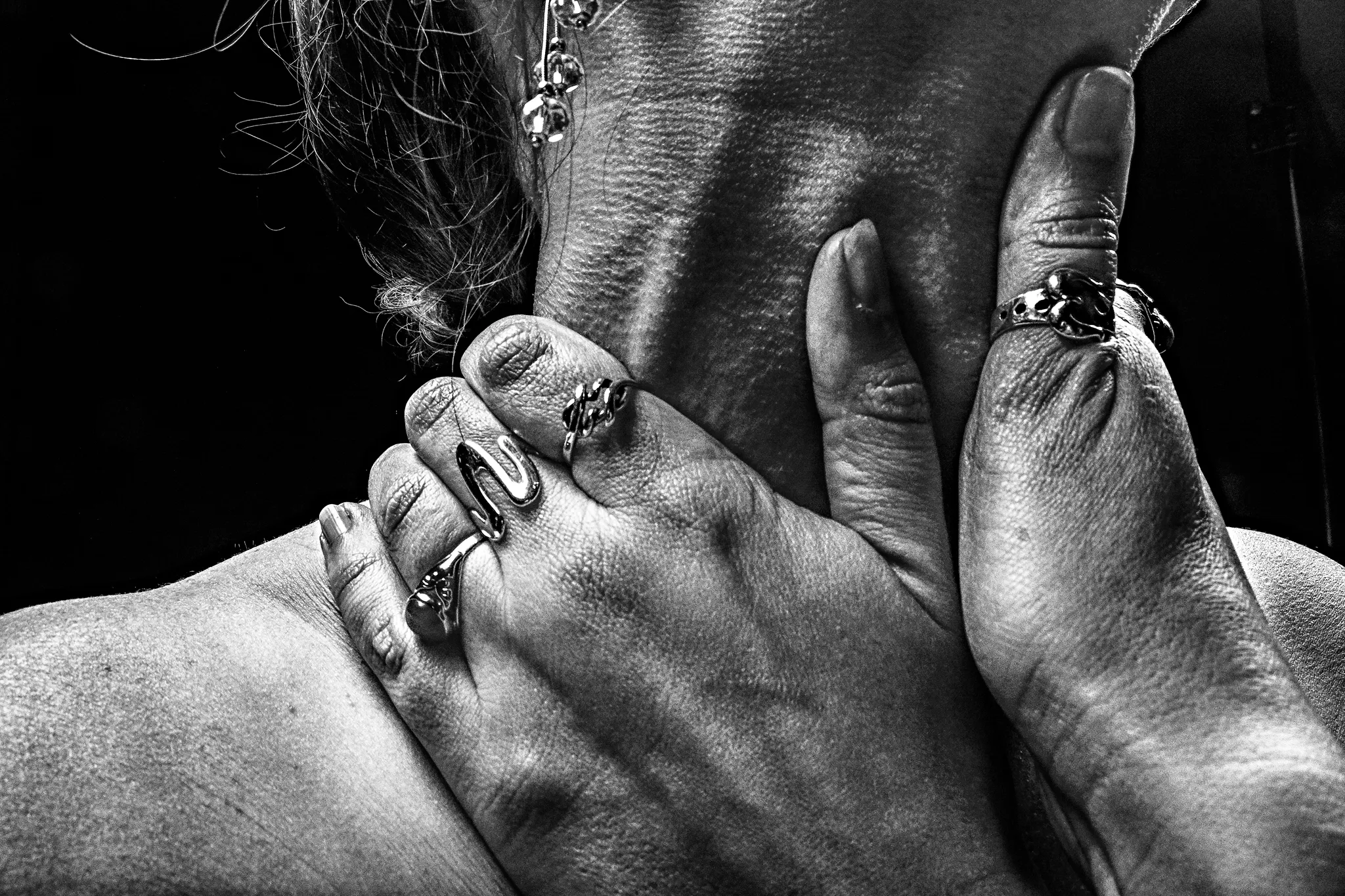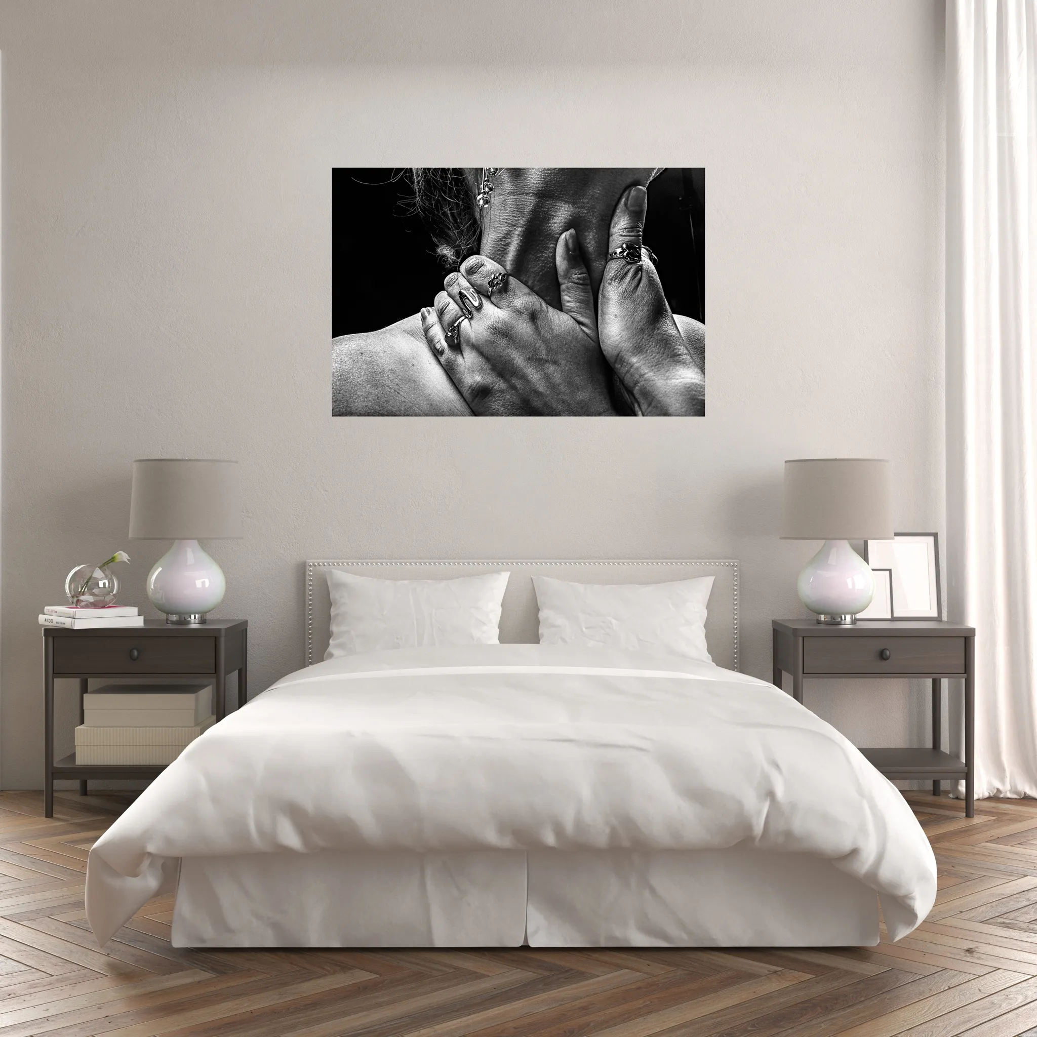 Przed Tobą dzieło, które hipnotyzuje swoją intensywnością. Kompozycja przedstawia dwie dłonie zaciśnięte na nagiej szyi, ujęte w dynamicznej, lekko przerysowanej perspektywie, co potęguje wrażenie napięcia. Wybór **czarno-białej tonacji** nie jest przypadkowy – eliminuje rozpraszające kolory, skupiając całą uwagę na grze światła, cienia, fakturze skóry i sile gestu. To studium relacji, władzy, wrażliwości… interpretacja pozostaje otwarta, rezonując inaczej z każdym obserwatorem.