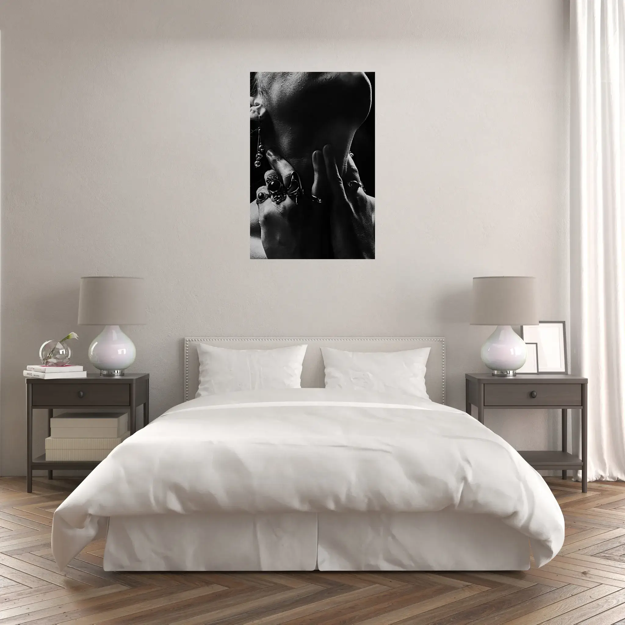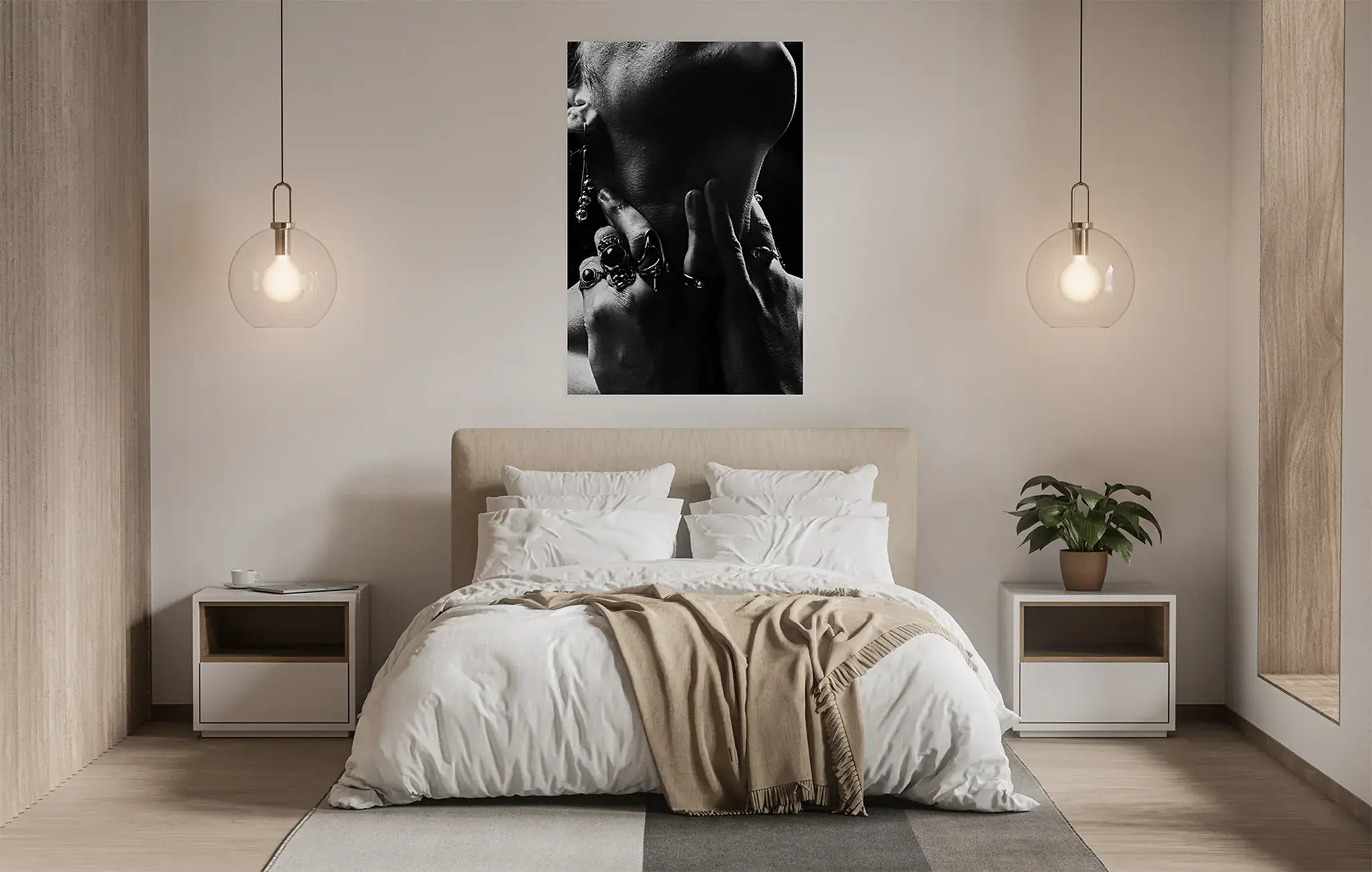 Ten fotoobraz to zaproszenie do kontemplacji. Przedstawia fragmentaryczne, pełne subtelności ujęcie kobiecej szyi otulonej dłońmi – gest uchwycony w momencie intymności i delikatności. Kompozycja celowo operuje niedopowiedzeniem, grą światła i cienia, pozostawiając pole dla Twojej wyobraźni. To nie jest zwykły portret – to esencja zmysłowości i tajemnicy zaklęta w artystycznym kadrze, który każdego dnia możesz odkrywać na nowo.
